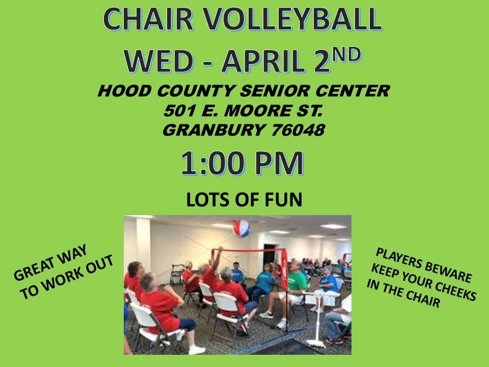 CHAIR VOLLEYBALL - HOOD COUNTY SR. CTR. Wednesday, April 2, 2025 1:00 PM 2:00 PM Hood County Democratic Party P.O. Box 6751 Granbury , TX 76049 United States (map) Google Calendar ICS